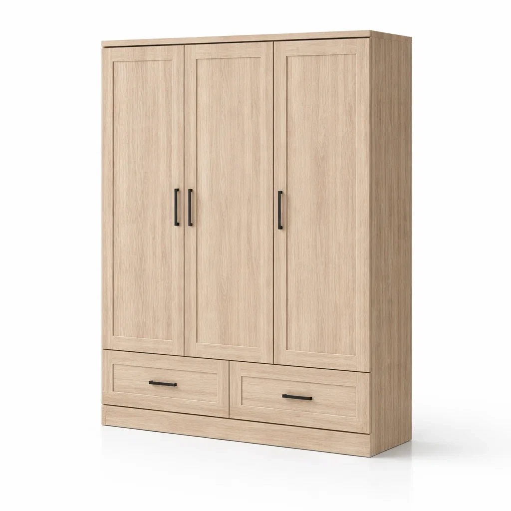 Dieser geräumige Kleiderschrank besteht aus stabilem Holzwerkstoff mit Eichenoptik. Er verfügt über drei Türen und zwei Schubladen, die zusätzlichen Stauraum bieten.