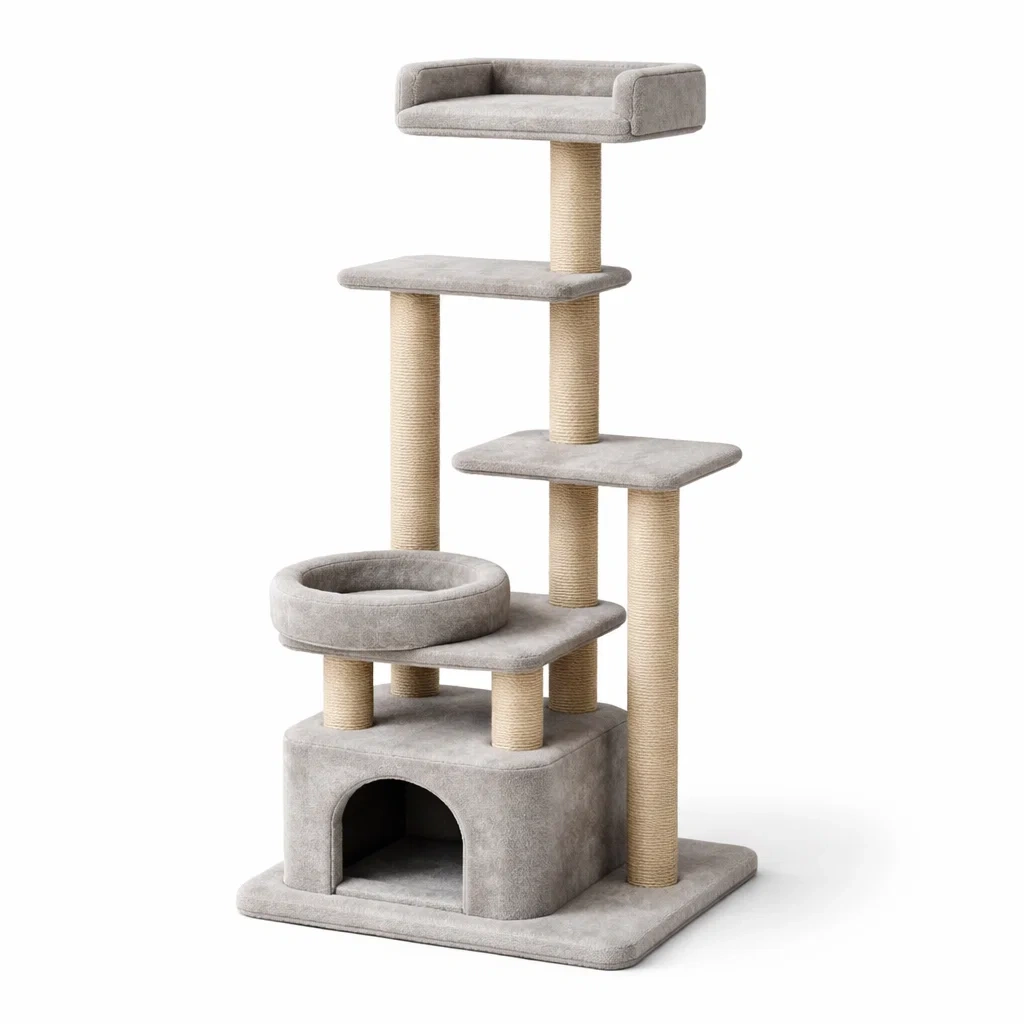 Ein Kratzbaum für Katzen mit mehreren Ebenen und einer Höhle. Das Produkt umfasst Liegeflächen, eine Röhre und eine Höhle.